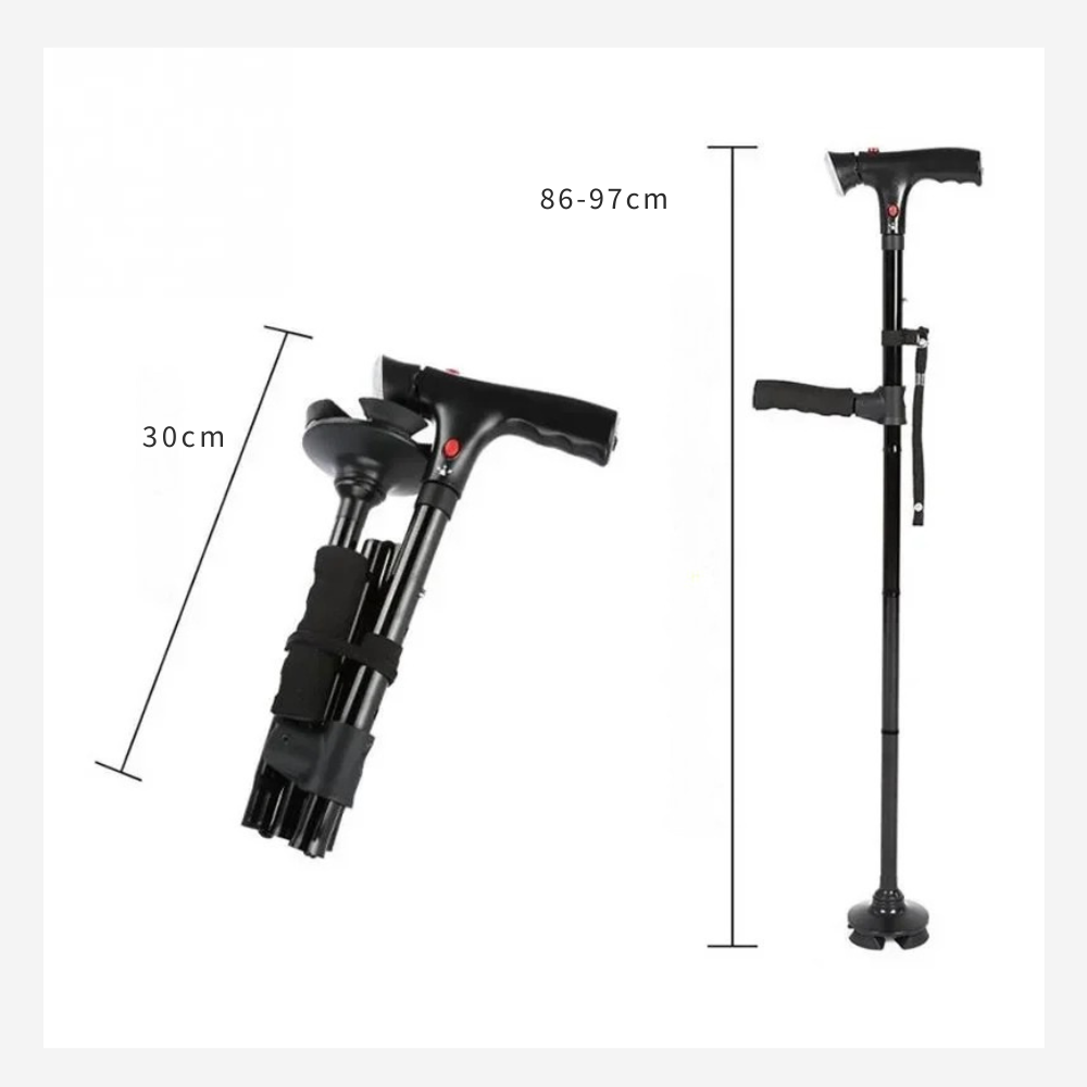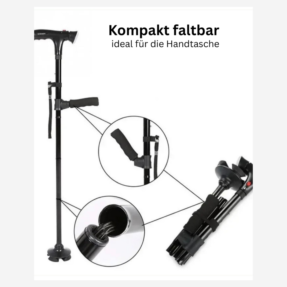 Der Gehstock lässt sich mit wenigen Handgriffen dreifach zusammenklappen und platzsparend verstauen – in der Tasche, im Auto oder auf Reisen. Dank der mitgelieferten Klettbindung bleibt alles kompakt und griffbereit. Einfach aufklappen, aufstützen, loslaufen.